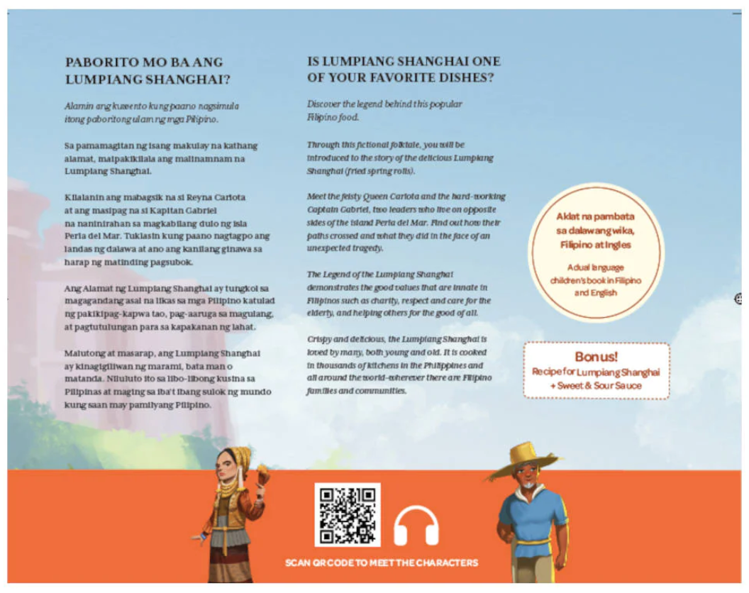 “Ang Alamat ng Lumpiang Shanghai” is a picture book written in Filipino and in English by cookbook author and culinary expert Nina Daza Puyat. It tells the story of how this beloved Filipino dish might have been invented.