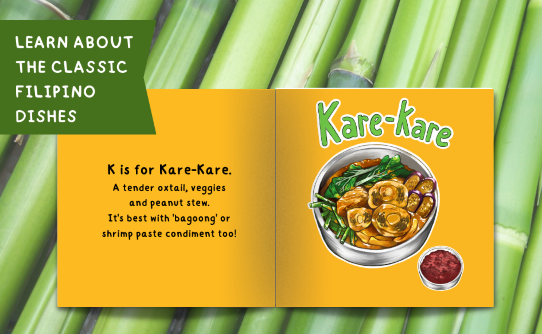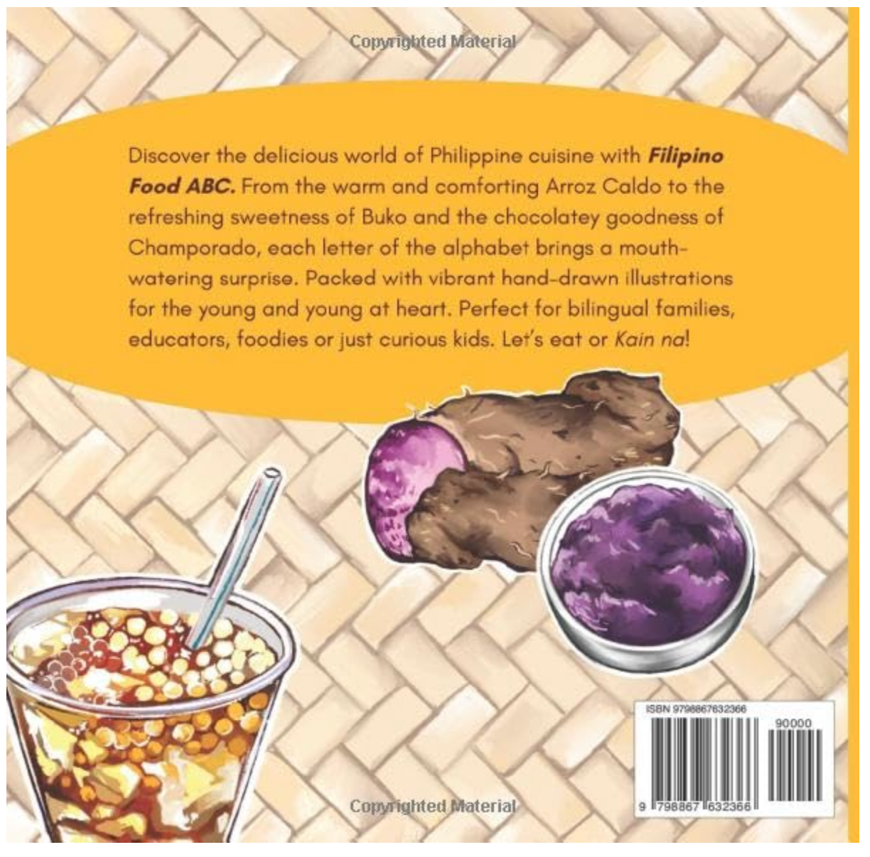 This fun book perfect for kids aged 2-12 years old, explores the different delicious cuisines of the Philippines! From the favourite chocolatey breakfast Champorado to the soothing dish Kare Kare and the absolute dessert Halo-halo, "Filipino Food ABC" will take you through a fun adventure for the taste buds! Go through the beautiful illustrations and fun rhymes of each page as you learn the ABC along with the scrumptious and mouth-watering Filipino cuisine!