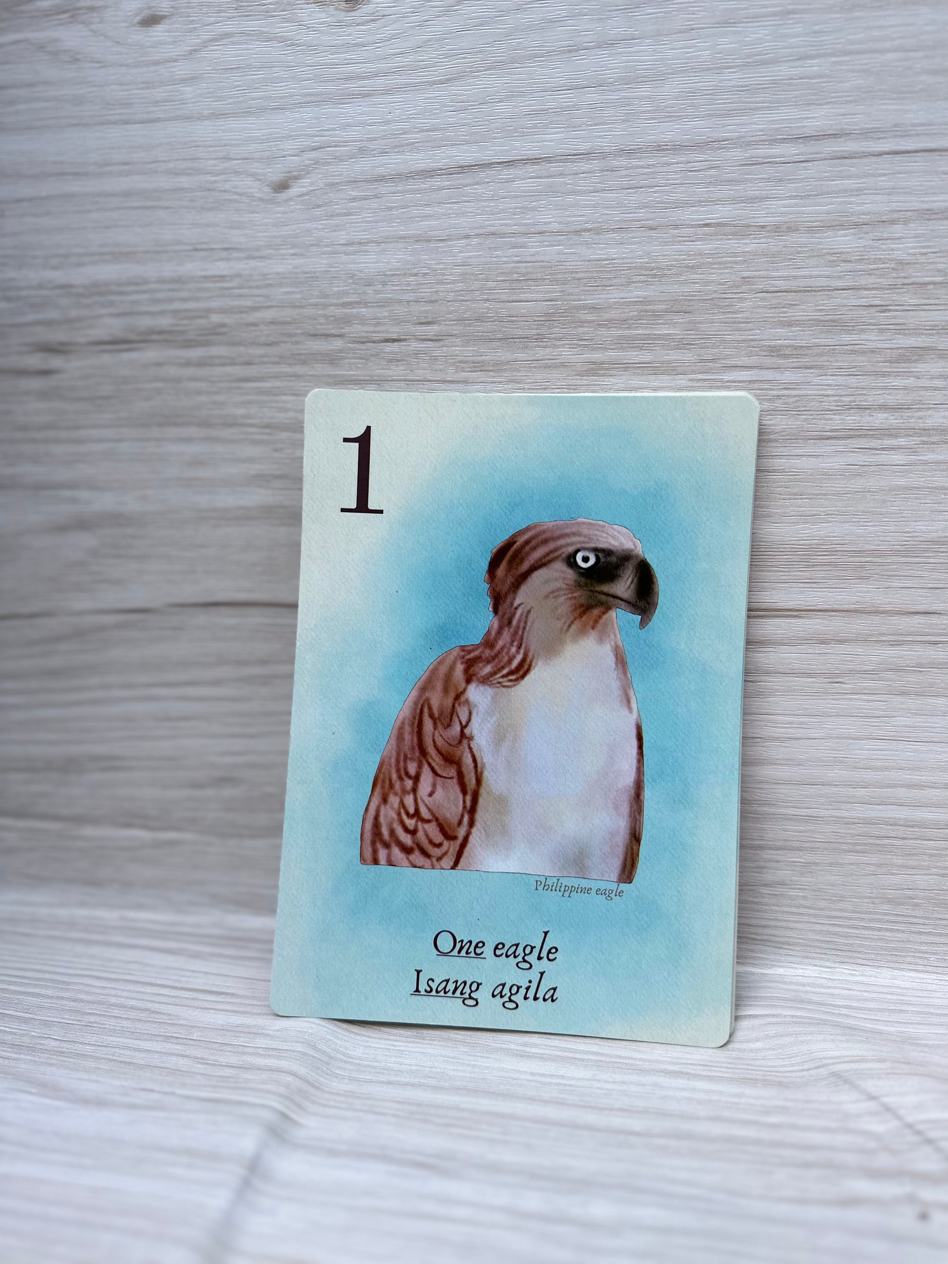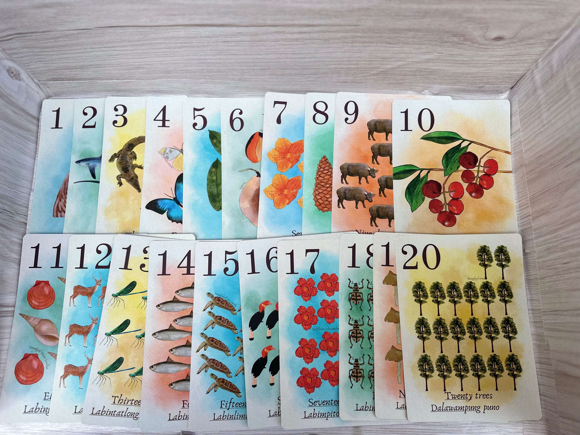 Numbers 1-20 in English and Tagalog, 5x7 inches on 250 gsm card stock with matte laminate finish